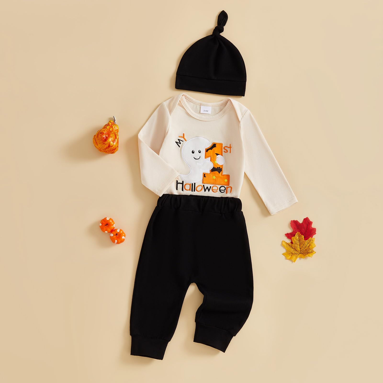 - 👻【Feature】: My 1st Halloween outfit for baby girl boys.Baby romper with long sleeve, expandable shoulder, cute and funny ghost letter embroidery, bottom snap closure for easy diaper changing; Pants: Elastic waistband; baby pants set matching with a top knot hat. Casual style and classic color, make this three-piece baby Halloween outfit look fascinating and fashionable; Your child will get tons of compliments in this cute infant clothes set